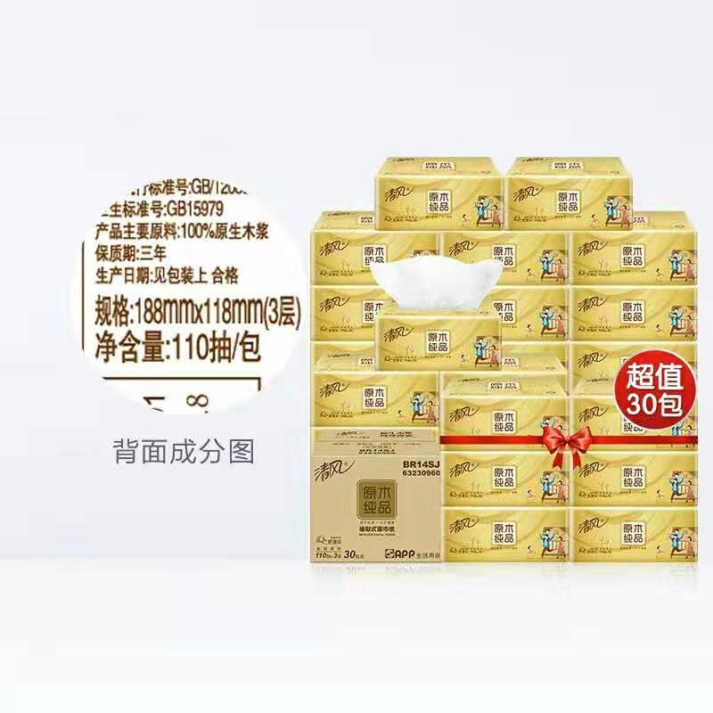清风(APP) 抽纸 原木纯品金装系列 3层110抽*30包(188*118) 软抽抽纸(整箱销售)