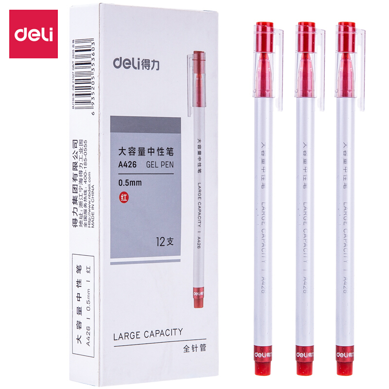 得力A426学生中性笔0.5mm全针管(红)12支/盒