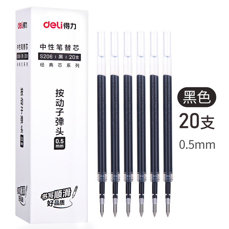 得力S206中性笔替芯0.5mm按动子弹头(黑)