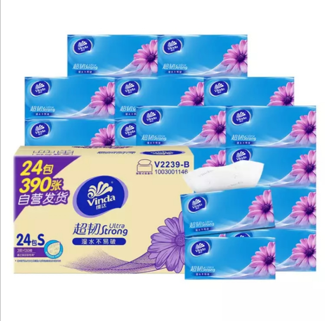 维达(Vinda) 抽纸 超韧3层130抽软抽*24包纸巾(真S码) 整箱销售 湿水不易破