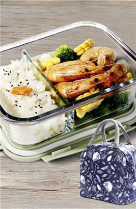德玛斯 耐热玻璃保鲜盒 微波炉专用饭盒 密封便当盒带盖碗 北欧绿分隔1000ml+包+餐具 |