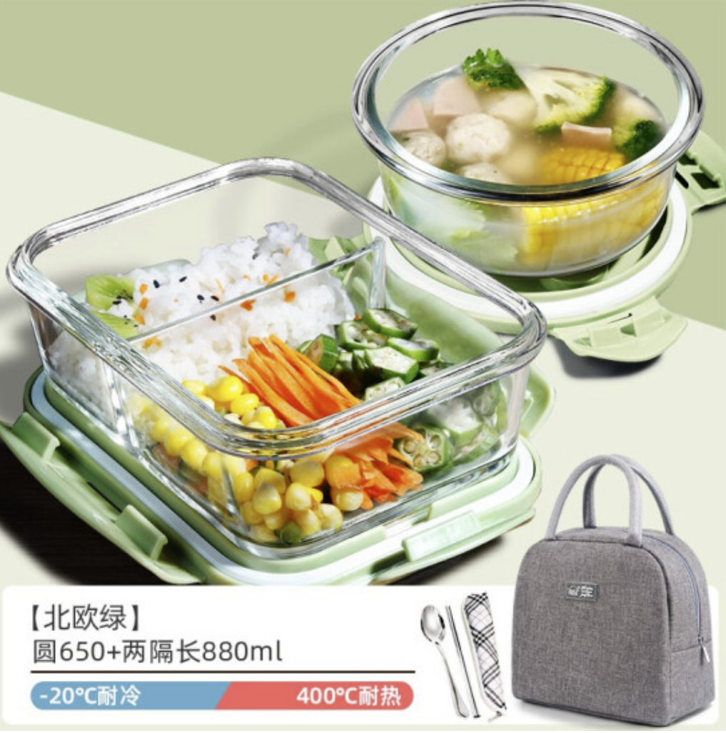 创得 耐热玻璃保鲜盒 微波炉专用饭盒上班族学生带饭密封碗分隔便当盒套装配饭盒袋 北欧绿650+880+包+餐具 |