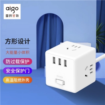 爱国者(aigo)魔方智能USB插座 插线板/插排/排插/接线板/拖线板 3位插孔+3USB防过载 全长1.5