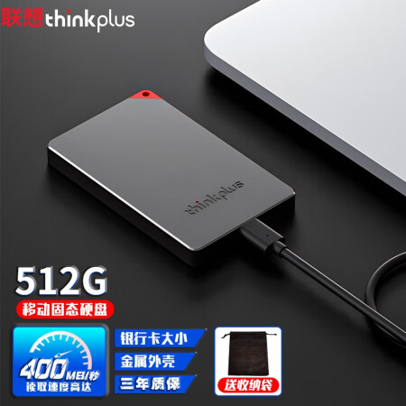 联想 thinkplus移动固态硬盘 USB3.1高速PSSD移动硬盘小巧便携读取400MB/S US100黑色 512G(需要红色请备注)