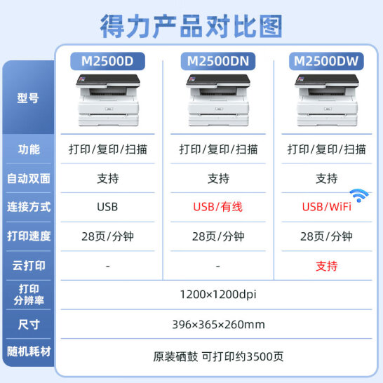 得力(deli)M2500DW 黑白激光三合一多功能一体机 无线双面打印 家用办公双面打印机(双面云打印 复印 扫描) |