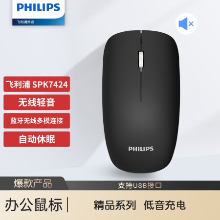 飞利浦 PHILIPS SPK7424BSC 鼠标 无线蓝牙鼠标 办公鼠标 低音鼠标 充电鼠标 金属滚轮 黑色 1600dpi