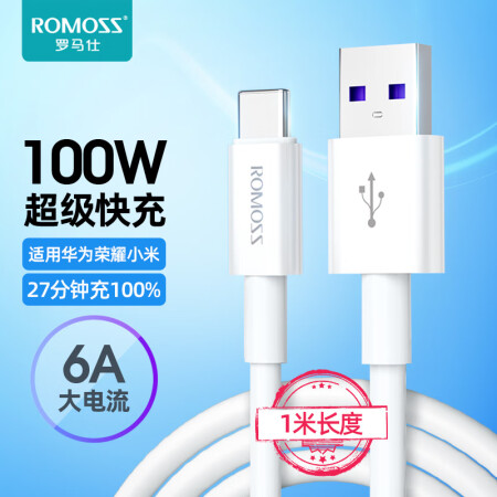 罗马仕 Type-C数据线6A超级快充100W/66W通用华为充电线P50/Mate40荣耀60Pro/50小米安卓手机线车载1m |