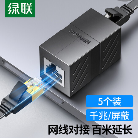 绿联 网线转接头 对接头 千兆屏蔽网络延长连接器 RJ45网线直通头水晶头双通头5/6类网线通用 黑色 5个装