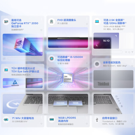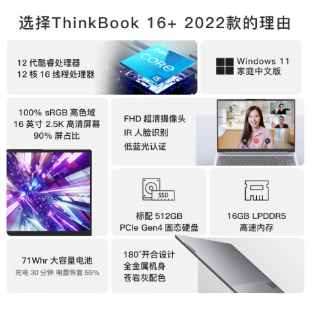 联想ThinkBook 16+ 英特尔酷睿i5 16英寸i5-12500H 16G 512G 2.5K |