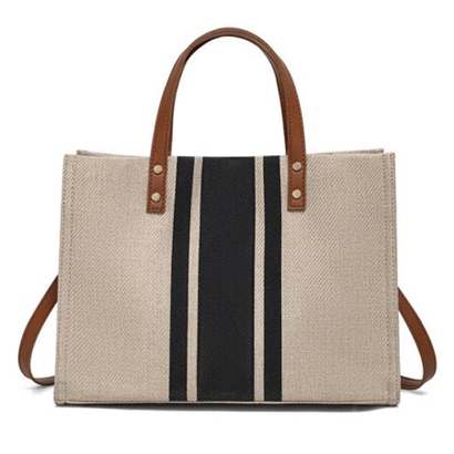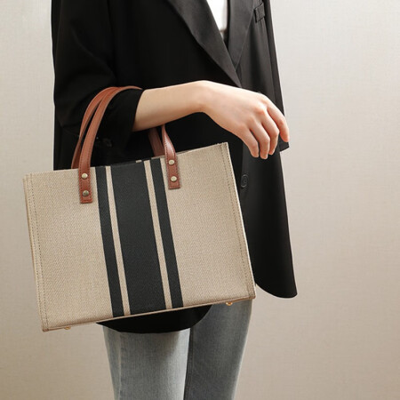 木丁丁韩版女士托特包手提公文包职业通勤条纹简约单肩包大容量帆布包 黑色条纹磁扣版 |