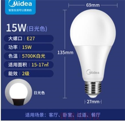 美的(Midea)led灯泡节能E27大螺口螺纹球泡15W正白五只装 |