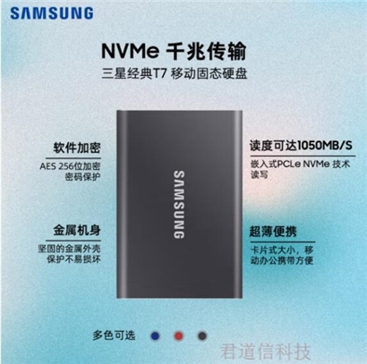 三星(SAMSUNG) 2TB Type-c USB 3.2 移动固态硬盘(PSSD) T7 灰色 NVMe传输速度1050MB/s 超薄时尚
