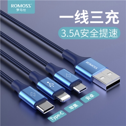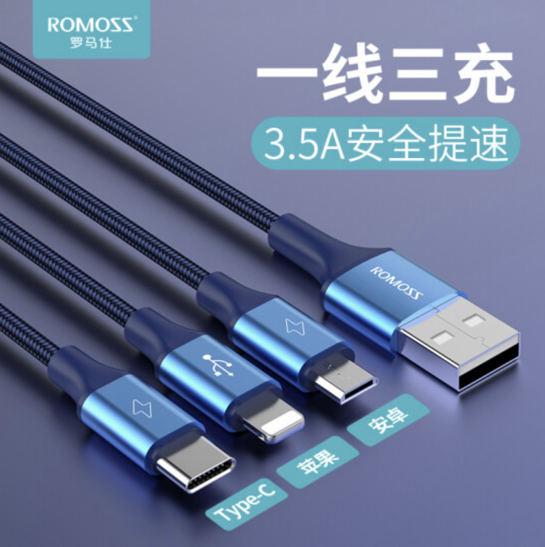 罗马仕 数据线三合一苹果Type-c安卓手机充电线多功能一拖三头适用苹果/小米华为荣耀三星vivo 1.5米车载多用