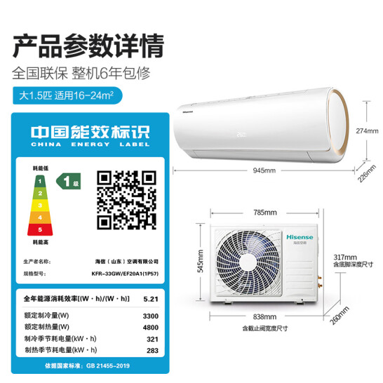 海信 (Hisense)1.5匹 自然风 新一级能效变频冷暖APP智控壁挂式空调挂机 京东小家智能生态 KFR-33GW/EF20A1