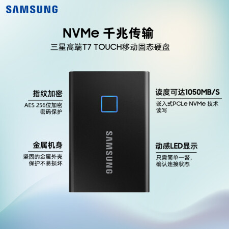 三星(SAMSUNG) 2TB Type-c USB 3.2 移动固态硬盘(PSSD) T7 Touch 黑色 NVMe传输速度1050MB/s 指纹识别 |