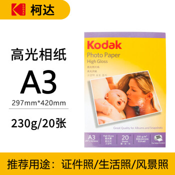 柯达Kodak A3 230g 高光面照片纸 喷墨打印相片纸 相纸 20张/包 |